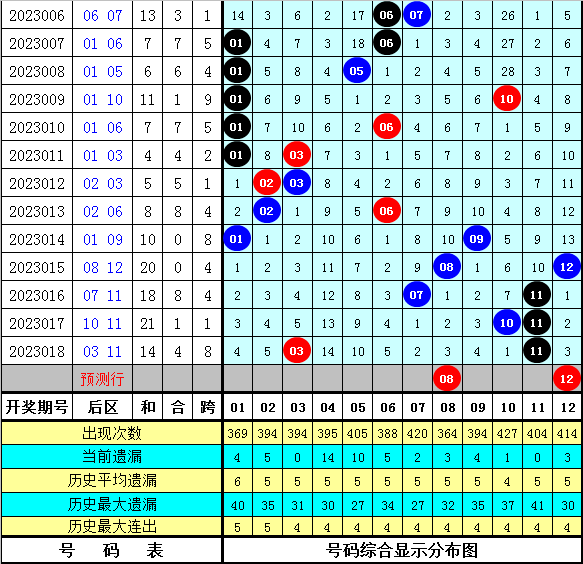 在2014019期-2016019期同周期奖号中,前区连码出现0期,同尾号出现2期,号码奇偶比4:11,大小比7:8,号码012路比3:5:7,前区开出14个号码。