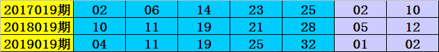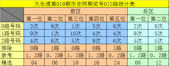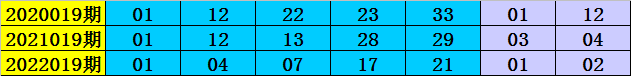 在2020019期-2022019期同周期奖号中,前区连码出现2期,同尾号出现2期,号码奇偶比10:5,大小比6:9,号码012路比4:8:3,前区开出12个号码。
